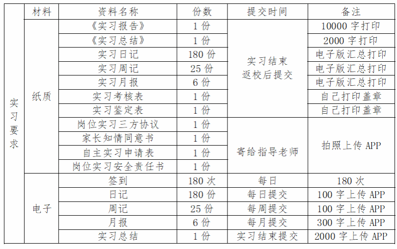 会上,指导老师详细解读了本次实习的核心安排与具体要求。本次实习时间为2025年11月17日至2026年5月17日,暂定返校时间为2026年5月18日。具体实习提交材料安排如下:
